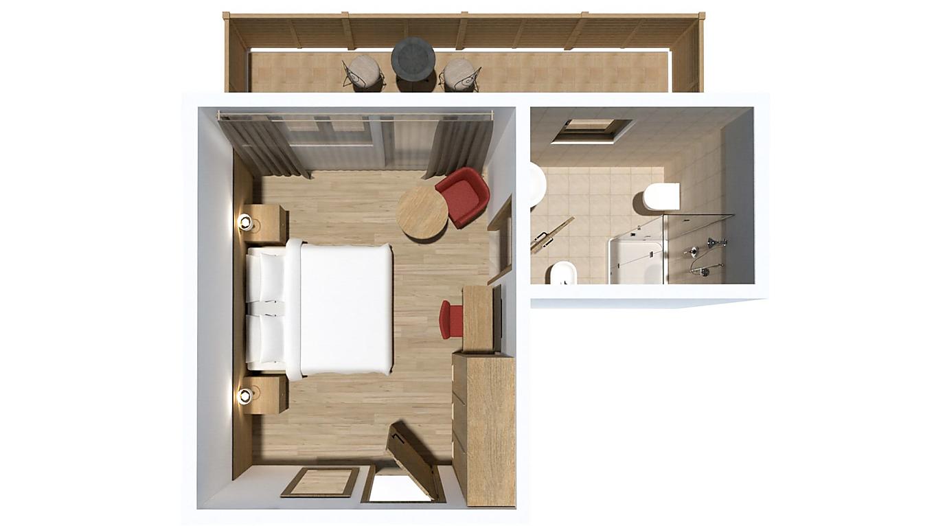 Our Classic rooms are east facing, with a view of the forest behind the hotel. The rustically styled furnishing is realized in bright wood, the bathrooms are equipped with a shower. All rooms have parquet floors.
