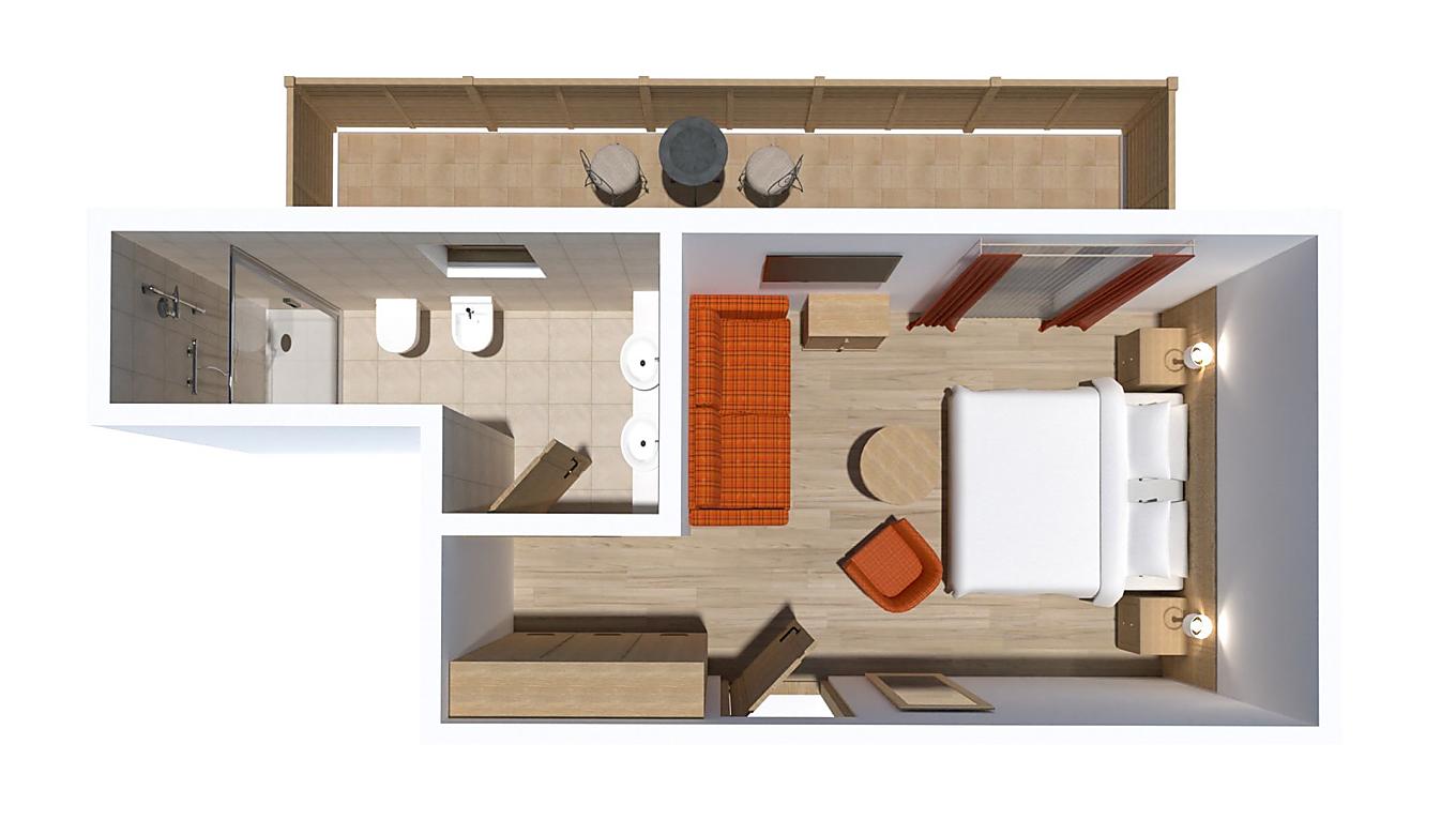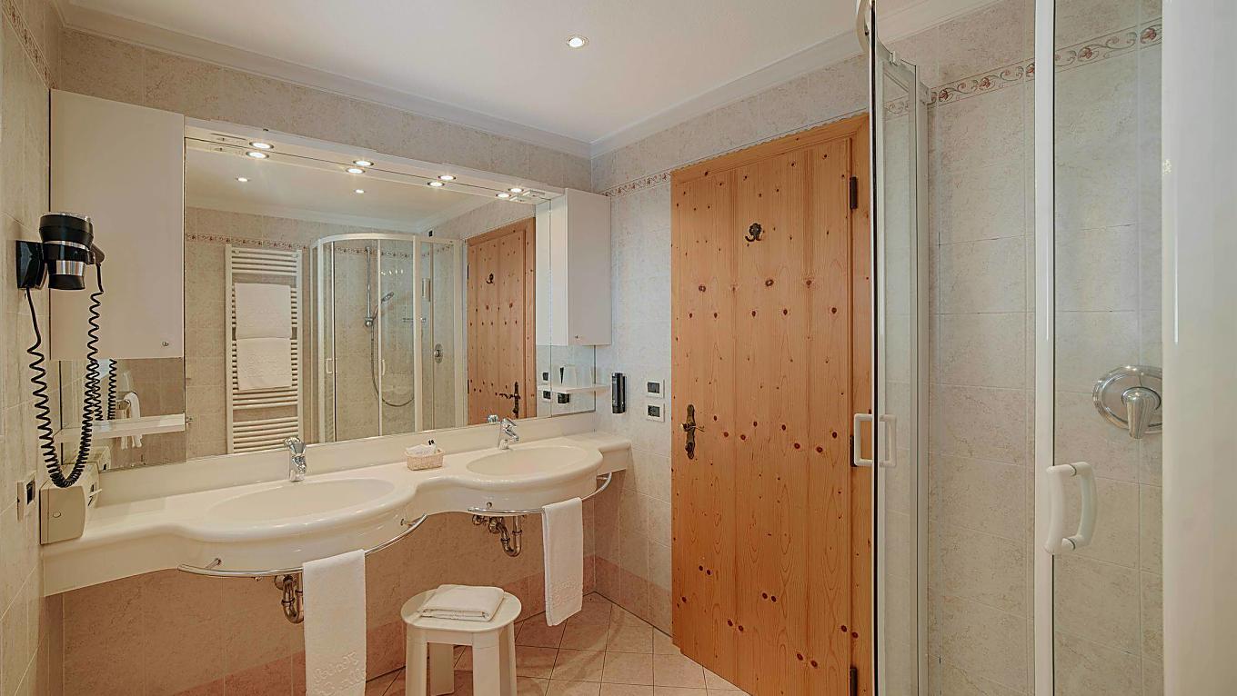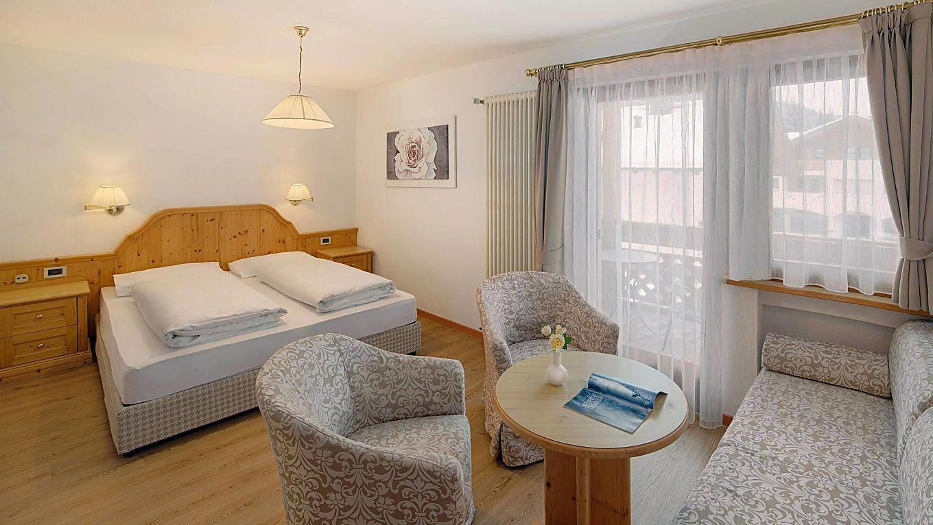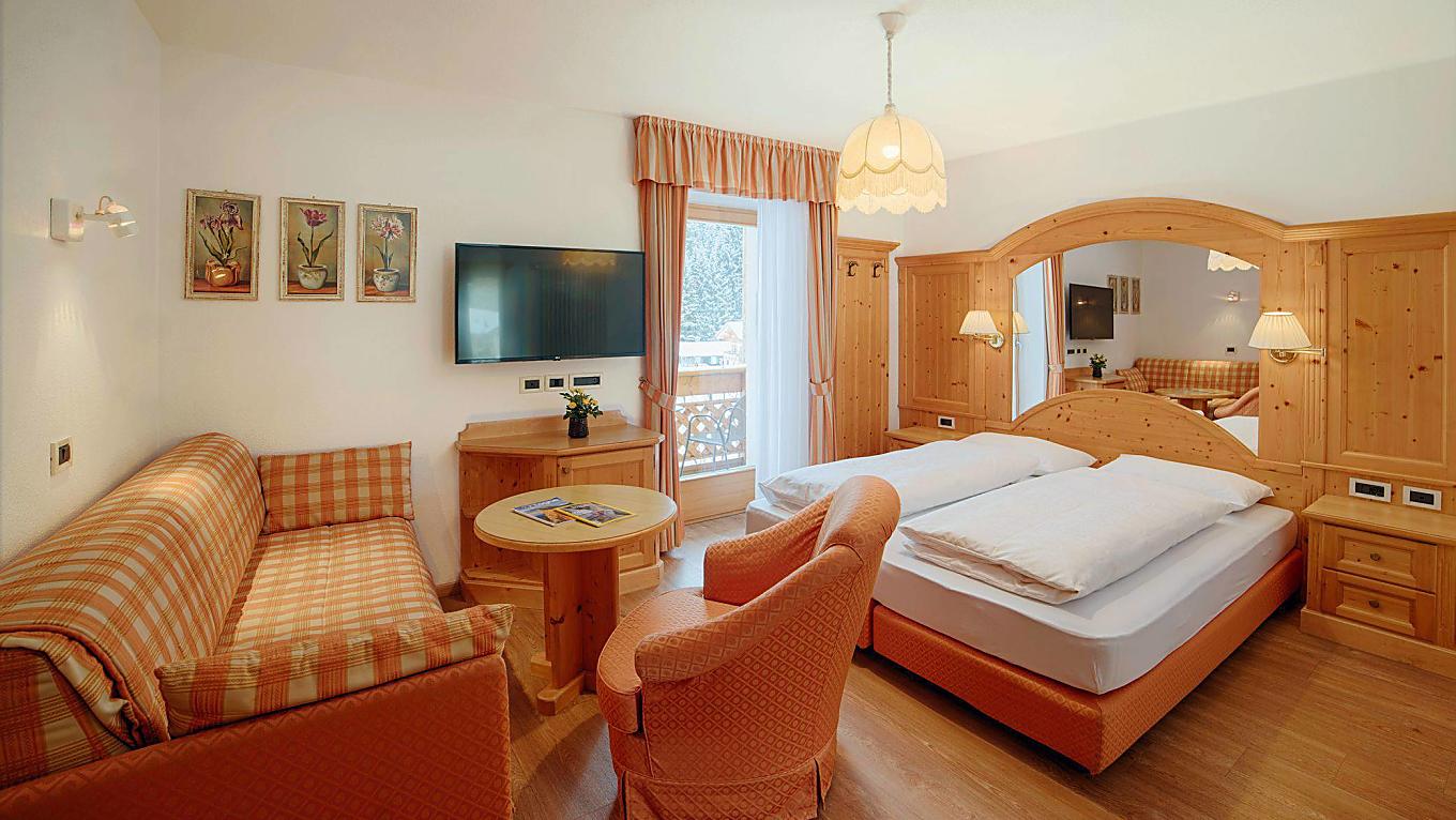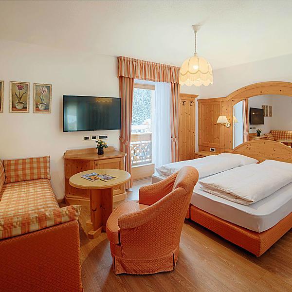 Le nostre camere Comfort sono esposte ad est, con vista sul Gruppo del Sella e il Passo Gardena, oppure a nord, con vista sulla montagna del Sassongher.